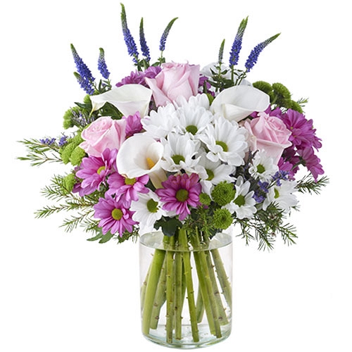 As sweet as an icecream. This bouquet of pink roses and white callas is perfect to enjoy a breath of fresh air through flowers. The composition is completed with the pink, white and green chrysanthemums, and the blue veronicas that could well be the topping of a delicate dessert.