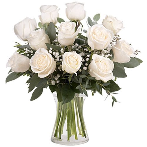 Share a touch of class with your loved ones with our 12 white rose bouquet. With elegance, class and purity a dozen white roses is a graceful way to express your feelings on occasions where only pure emotion will do such as weddings, anniversaries and demonstrations of love.