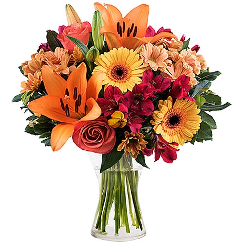 Enjoy this elegant display of orange and peach coloured excellence and the positive vibes it radiates. With roses, lilies and alstroemerias displaying these happy peach and orange colours this is the ideal bouquet to share on a happy occasion.