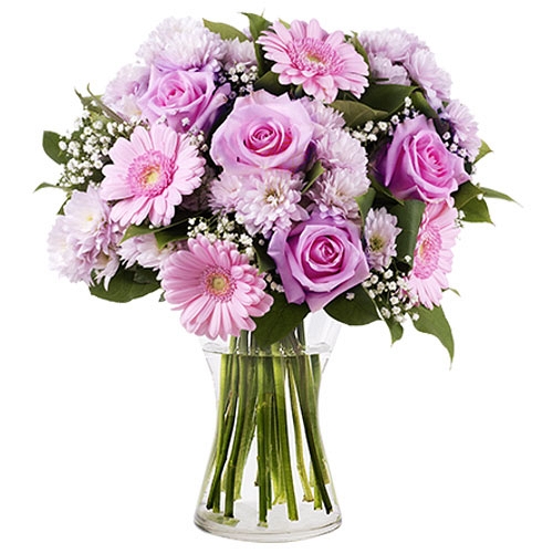 Pink Roses and Gerberas Roses, gerberas, chrysanthemums and gypsophila make up this fabulous bouquet. Its pink tones are complemented with greenery to highlight the natural beauty of the flowers. An ideal choice to decorate any room with a sweet and delicate detail.