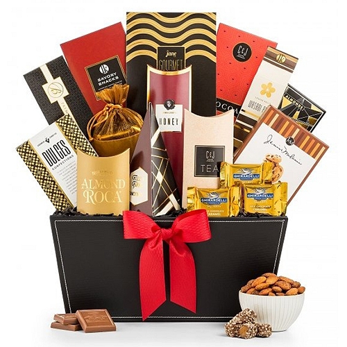 With creamy butter toffee caramels, luscious Almond Roca, gourmet savory popcorn and much more, this generous gift basket promises to show your best wishes in a delicious fashion.