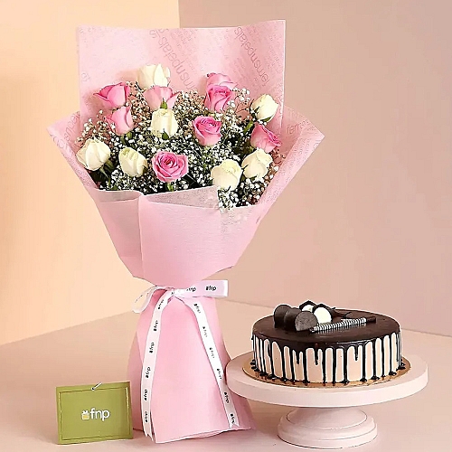Fall in love with this unique bouquet of white and pink roses wrapped beautifully. Sprinkled with White Gypsophila Fillers, this sassy but sweet bunch looks simply magical. Let your special someone know how much you care with the help of this spellbinding bouquet. The heavenly taste of the chocolate cream cake will elevate the experience of joy.