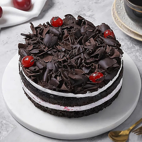 Black Forest Cake A rich and moist black forest cake loaded with chocolate, whipped cream and cherries. This is one of the most popular cake among our customer. 1 Kg Black Forest Cake goes very well with any occasion: Birthday, Anniversary, Valentines Day, Wedding or Christmas. Ingredients: Chocolate premix, Refined oil, Breakfast Sugar, Whip topping cream, Chocolate Truffle Base, Dark Chocolate compound, Red Cherry Product Details: Cake Flavour- Black Forest Type of Cake - Cream Shape- Round Weight: 1-KG Diameter: 9 inch Serves: 10-12 People