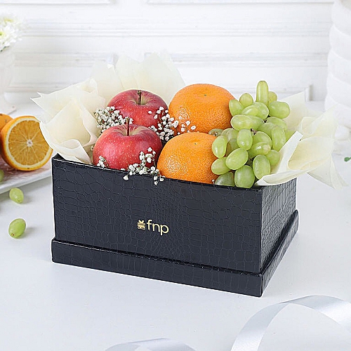 Gypsy Garden Fruit Ensemble Celebrate the joy of gifting with our delightful fusion of natures best. Fresh grapes, succulent oranges, and crisp apples come together in a harmonious arrangement, adorned with charming gypsy flowers. Presented in an elegant black box, this ensemble captures the essence of both flavours and aesthetics. An impeccable gift for those who appreciate the art of sharing lifes simple pleasures. Product Details: Fresh grapes: 400gms Fresh orange: 2 Pcs Fresh apple: 2 Pcs Embellished with gypsy flower