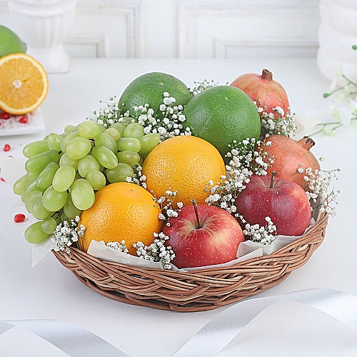 Medley Fruit Basket Experience the joy of gifting with our captivating fusion of natures treasures. Fresh limes, oranges, apples, pomegranates, and succulent grapes come together in a harmonious arrangement, nestled within a rustic brown cane basket. Adorned with charming gypsy filler, this ensemble is a thoughtful gesture for anyone who appreciates the beauty of both fruits and flowers. A delightful gift to convey your heartfelt sentiments and share lifes flavorful moments. Product Details: Fresh lime: 2 Pcs Fresh pomegranate: 2 Pcs Fresh grapes: 400gms Fresh orange: 2 Pcs Fresh apple: 2 Pcs Embellished with gypsy filler brown basket: 25 x 7.5cm