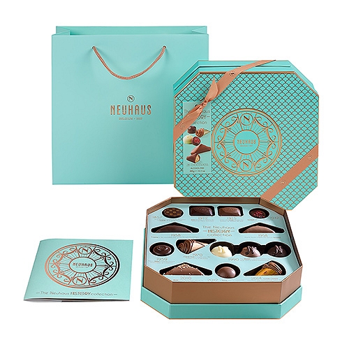 As the inventors of the praline (Belgian filled chocolates) and the celebrated “ballotin” box, the Neuhaus family has created a legacy of timeless classics that are still with us today. So now it's time to tell our story. The most delectable way to remind you of generations of pleasure is to fill a splendid box with a sumptuous selection of our most iconic creations in unforgettable chocolate! The gift box contains 28 delicious masterpieces and a brochure explaining the rich history of Neuhaus, presented in an elegant fitting luxury shopping bag.