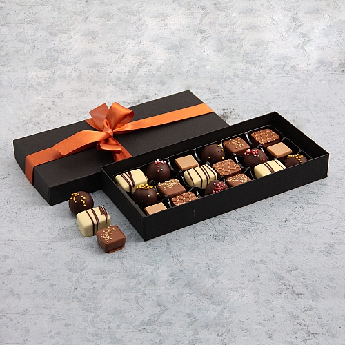 18 Pieces Belgian Chocolates A cheerful celebration ‘Belgian chocolate treat box’….. it’s a fabulous selection of indulging chocolate pleasure. They make perfect mini bites which simply melt in mouth leaving the craving for more. Give a spoiling treat to the loved ones or grab a box for yourself too. The Chocolate Gift Box Includes: Approx 18 Pieces of finest Belgian Chocolates Containing Hazelnut Cream Double Milk Praline Double layer Praline Almond Praline with Orange Pieces Hazelnut Praline with Biscuits and Pistachio Pieces Rosette of Praline Decorated with Walnut on top Weight: 350gm Dietary Information: Suitable for Vegetarians Alochol Free Product contains nuts, whole milk and soya Features: Items are packaged in a stylish Gift Box Arrives decorated with a hand-tied satin ribbon. Personalize It! Complete the personalisation option during checkout and we'll print your message on a satin ribbon. One line with up to 30 characters with Text repeats across entire ribbon. Delivery: Order by 11am for next day Delivery in UK and Mainland Scotland Home or Business address. Deliveries to Channel Islands, Scottish Higlands, Nothern Island, and certain Postcodes delivery may take 2 -3 Working days.Most of our Hampers range are available for delivery From Monday - Saturday. Orders received after 11am GMT on Friday, weekends or on Bank Holidays we will despatch the products on the 1st working day for next day Delivery.