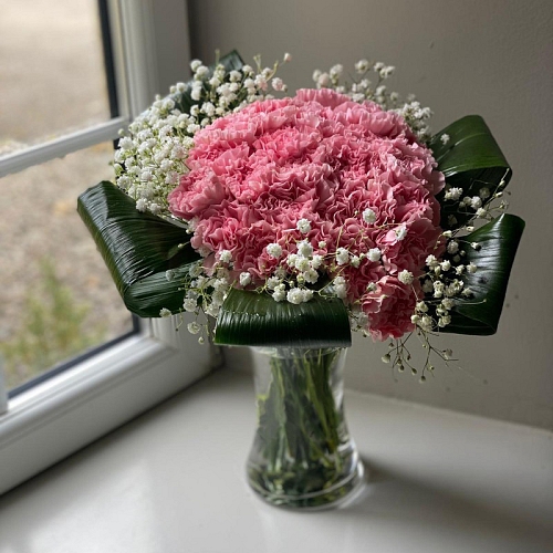 2 Dozen Pink Carnations Make their day extra special with our fresh pink and white 2 Dozen Pink Carnations bouquet. Featuring 24 pink carnations, this exuberant bouquet will bring a touch of lively floral splendour to any setting. This gorgeous arrangement of pink carnations with gypsophila is a truly thoughtful gift for your special someone to cherish. The 2 Dozen Pink Carnations Bouquet will be a fantastic gift on any occasion such as birthdays, anniversaries, or as a means to express gratitude or sympathy. Carnations have connotations of luck, so this bouquet could be a great way to wish someone fortune as they embark on a new chapter of their life. Fresh pink carnations complemented by white gyp and aspidistra Vase not inclided.