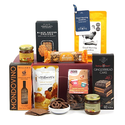 Coffee Break Hamper A truly ellegant and classic coffee and sweet treats hamper with Great Taste Award winners to elevate every coffee breaks. With hand roasted coffees, caramel chocolate pretzels, orange & pecans popcorn bar, salted carael chocolate nuts, black pepper and morrocan spice crackers, this hand packed and carefully curated gift box of award-winning products will delight any coffee lover! This gift is beautifully presented in a reusable hampre box with eco-friendly natural filler and is accompanied by a card with your personal message, and a hand tied ribbon to finish. A beautiful gift for anniversaries, birthdays, Christmas, Father’s Day, Mother’s Day, saying thank you or any other special occasion. What’s in the gift? This coffee and chocolate hamper gift includes: Salted Caramel Chocolate & Nut Mix 75g Joe & Seph's Orange, Pecan & Cinnamon Popcorn bar 27g Flower & White - Salted Caramel Pretzels 100g Kopernik Gingerbread Cake 180g VERDUIJN'S Black Pepper Crackers with Sea Salt 75g Mondovino - Moroccan Spice Savoury Crackers 125G Wild & fruitful Seville Orange Marmalade 110g Wild & fruitful Pear & Walnut Chutney 110G Good Morning Sunshine Medium to Dark roast Ground Coffee 250g