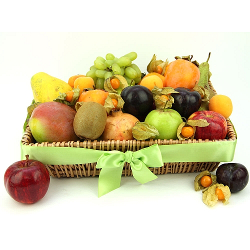 Winter Charm Fruit Basket Give your heartiest greetings to your loved ones back home with this Winter Charm Fruit Basket delivery. You will find the most fresh and exotic flavors of various fruit varieties all assembled in this cane basket wrapped with silky ribbon. The basket has abundant fruits which are farm fresh and well packed to be reached safely to your loved ones on their special occasions like Birthday, Anniversary, Christmas, Thanksgiving or any other joyous event. Send this grand fruit basket by post to UK with your personal message card attached. Hamper Contains: Orange Clementines Mango Poemgranate Red Gala Apples Smith Apples Papaya MAngo Pear Green Grapes Persimmon Physalis Weight: 3.75kg Comes in Beautiful Basket elegantly gift wrapped with Ribbon and Free personalised message card.