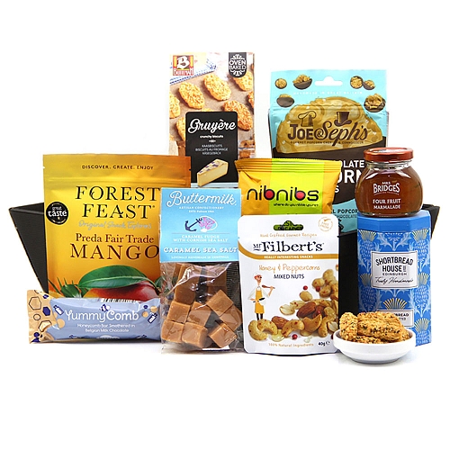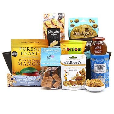 Joe and Seph’s milk chocolate popcorn bites 63g Buiteman Cheddar Cheese Biscuits 75g YummyComb Milk chocolate Honecomb bar 35g Buttermilk caramel sea salt fudge 175g Mr Filberts Honey Peppercorn Mixed Nuts 40g NibNibs Rosemary mini breadsticks 25g Forest Feast Preda Mango 100g Shortbread House clotted cream biscuits 140g Mrs Bridges fine cut orange marmalade 113g