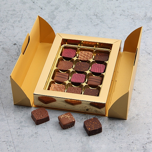 Belgian Chocolate Treat A cheerful celebration ‘Belgian chocolate treat box’….. it’s a fabulous selection of indulging chocolate pleasure. They make perfect mini bites which simply melt in mouth leaving the craving for more. Give a spoiling treat to the loved ones or grab a box for yourself too. The Chocolate Gift Box Includes: Approx 12 Pieces of finest Belgian Chocolates Containing Hazelnut Cream Double Milk Praline Double layer Praline Almond Praline with Orange Pieces Hazelnut Praline with Biscuits and Pistachio Pieces Rosette of Praline Decorated with Walnut on top Weight: 250gm Dietary Information: Suitable for Vegetarians Alochol Free Product contains nuts, whole milk and soya Features: Items are packaged in a stylish Gift Box Arrives decorated with a hand-tied satin ribbon. Personalize It! Complete the personalisation option during checkout and we'll print your message on a satin ribbon. One line with up to 30 characters with Text repeats across entire ribbon. Delivery: Order by 11am for next day Delivery in UK and Mainland Scotland Home or Business address. Deliveries to Channel Islands, Scottish Higlands, Nothern Island, and certain Postcodes delivery may take 2 -3 Working days.Most of our Hampers range are available for delivery From Monday - Saturday. Orders received after 11am GMT on Friday, weekends or on Bank Holidays we will despatch the products on the 1st working day for next day Delivery.