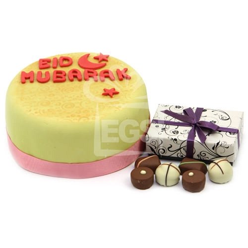 Chocolate Eid Cake Send this gorgeous hand finished eid celebration cake and mouth melting belgian chocolate pralines to celebrate the festive season of Eid with your loved ones. A Light and moist sponge cake topped with soft green icing and decorated with Stars, moon and Eid Greeting message on top. A perfect Eid Gift to be sent to your family and friends with next day delivery to all parts of UK. Available to order online in a Choice of vanilla or chocolate sponge base with the options of personalised message card and ribbon. You can personalise this Chocolate Eid Cake free with your message printed on the ribbon up to 25 characters in the box on right. Like all of our products we are very happy to gift wrap the cake using our crisp tissue paper and a bright ribbon. Just Select “Gift Wrapping” on the right when choosing your preferred cake flavour. Git Includes: Belgian chocolate box 125gm Chocolate or Vanilla Sponge Flavored Cake in a Choice of 7, 8, 10 inch Serving Suggestions: