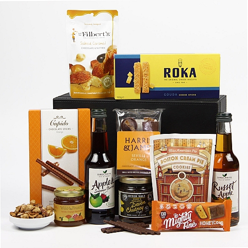 Hamper Contents: Mr Filberts Salted Caramel Chocolate & Nut Mix 75g Cupido dark chocolate orange Sticks 125g ROKA Gouda Cheese Sticks 100g Miss American Pie - Boston Cream Pie 75g Mighty Fine Chocolate Salted Caramel Honeycomb 30g Harris & James Salted Caramel Chocolates6's Otter Vale Devon Chutney Onion & Pineapple 225g Wild & Fruitful Seville Orange Marmalade 110g James White summer Berries Juice 250ml James White Russet AppleJuice 250ml Black Medium Box