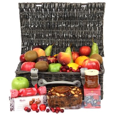 Festive Fruit Treat Treat your Family and Friends this christmas with this festive fruit treat hamper with next day delivery to Uk and london. Included with fresh fruits are crisp Chocolate cups and truffles along with rich fruit cake and Tea to enjoy the dark winter afternoons.This thoughtful arrangement is guaranteed to delight no matter the occasion. Hamper Contains: Pears Red Apples Green Apples Orange Kiwi Plum Peach Country fare Orange & Honey Fruit Cake Loaf 700g Mrs Bridges Pink Grapefruit Marmalade 113g Buttlers Milk Chocolate Truffles 25g Noble Milk Chocolate crispy Cups 42g New English Teas English Breakfast 10s