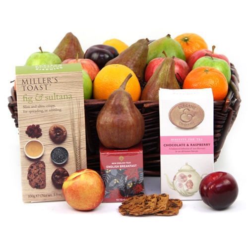 Fruit Toast Hamper A delightful collection of fresh fruits, Artisan biscuits, tea and savoury crackers is the perfect gift to suit all occasions. This great variety of gourmet fruits are all well packed in a lovely wicker basket with luxury ribbon and personalsied message card makes this a superb celebration gift for friends and family alike. Contents: Millers Toast Fig & sultana Crackers 100g New English Teas English Breakfast 10s Artisan biscuits chocolate & raspberry 125g Red Apples Green Apples Pears Orange Plum Clementine