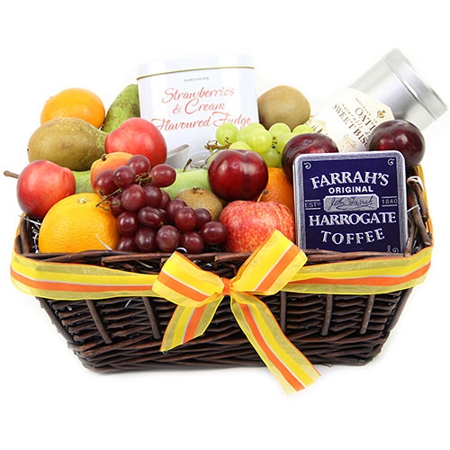 Glory Gourmet Fruit Basket Glory Gourmet Fruit Basket is a ravishing collection of different fresh fruits that are seasons best selection, along with additional confectionary items such as Gardiners Scottish Strawberry and cream fudge, Shortbread house Sweet oaties biscuits, Farahs Harrogate Toffee. This gigantic treat is filled with some mouthwatering contents that would mesmerize your loved one’s taste buds. It is a perfect gift basket for any special ceremony of Anniversary, Birthday, Christmas, or just for showing your affection. Send this stunning fruits basket by post to UK with your personal message card attached. Hamper Contains: Gala Apples Smith Apples Plums Kiwi Nectarines Pears Oranges Red Grapes 100gm Green Grapes 100gm Farah’s Harrogate Toffee 100gm Gardiners scottish strawberries and cream Fudge 300gm Shortbread house Sweet oaties biscuits 200gm Weight: 4.50kg