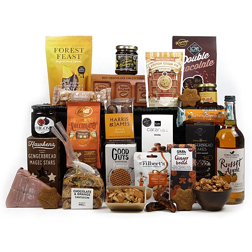 Hamper Contents: Forest Feast Dark Chocolate Mango Strips 100g Otter Vale Devon Chutney Onion & Pineapple 225g Good Guys Bakehouse Black Pepper Biscuit Melts 50g Mr Filberts Valencia Orange & Belgian Choc 40g Feletti sachet bag of Gianduiotti Classico assorted chocolates 150g Miss American Pie - Boston Cream Pie 75g Yummycomb Sea Salted Caramel Bar 35g Hawkens Gingerbread Magic stars Gnaw Ginger Bread Chocolate Bar 100g Kopernik - Chocolate Gingerbread with Apricot Filling 145g Seggiano - Chocolate & Orange Cantuccini 200g Harris & James Salted Caramel Chocolates6's Original Bakers Fruit Cake 90g Spice Kitchen Curry Collection 3x80g Love Popcorn Double Chocolate 80g Wild & Fruitful Seville Orange Marmalade 110g Higos Fig Jam 210g Fig & Almond wedge 250g Joe & Sephs Coconut & Peanut Bar 27g James White Russet AppleJuice 750ml Large Wicker Hamper