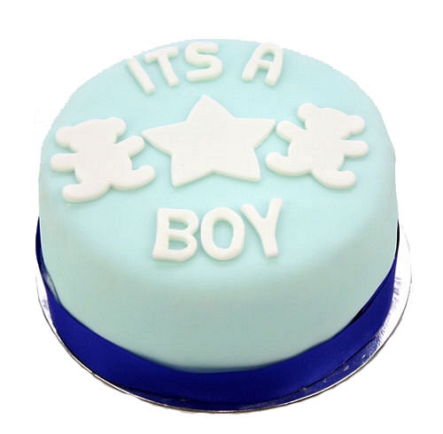 Its a Boy Cake This simple new baby cake covered with soft Blue icing and decorated with white bear and new baby message perfect to send to your loved ones on the arrival of new baby boy. Available to order online in a Choice of light golden vanilla sponge sandwiched between vanilla buttercream and raspberry or layers of rich chocolate sponge filled with indulgent chocolate buttercream and finished with our our luxury satin ribbon. You can also personalise this cake free with your message printed on the ribbon up to 25 characters in the box on right. There is no charge for ribbon personalisation Like all of our products we are very happy to gift wrap the cake using our crisp tissue paper and a bright ribbon. Just Select “Gift Wrapping” on the right when choosing your preferred cake flavour. Serving Suggestions: