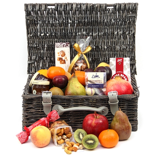 Joyful Fruit Hamper This exquisite gift is sure to impress.Packed inside a beautiful wicker basket, your recipient will discover an exquisite arrangement of fruits including crisp apples, juicy oranges, and sweet pears nestled amongst coveted gourmet snack foods like Jams,Chocolate covered Nuts and Coffee Beans this generous gift is perfect gift This christmas to your friends, family or work colleagues. Hamper Contains: Pears Oranges Clementines Smith Apples Royal Gala Apples Kiwis Plums Pomegranate Chocolate Covered Nuts 120gm Mrs Bridges Orange Marmalade 113g Mrs Bridges Strawberry Jam 113g Mr Filberts SeaSalted Mixed Nuts 50g Assorted Chocolate Truffles 60g