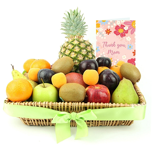 Seasons Delight Fruit Basket Make a perfect choice with this special Seasons Delight Fruit Basket enriched with nutritious fruits in a classic fruit basket. The fruits are assorted in a cane Basket wrapped by a silk ribbon, with your personal message card attached. You can choose this basket for any special occasion or Just For, to give your loved ones a healthy experience. Hamper Contains: Pineapple Oranges pear Kiwi Plum Red Gala Apples Smith Apples Apricots Clementines Mangoes Weight: 5KG
