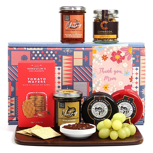 VERDUIJN'S Tomato Wafers with Basil 75g Highfield Preserves Sticky Onion Marmalade Jalapeno 220g Highfield Preserves Sweet Red Pepper Relish 210g Cambrooks Caramelised Nuts 45g Snowdonia cheese Black Bomber 200g Snowdonia cheese Bouncing Berry 200g Mothers Day Card