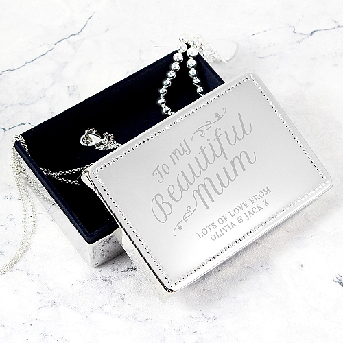 Personalised Beautiful Mum Rectangular Jewellery Box This two piece Beautiful Mum design jewellery box can be personalised on the front of the box with any message over 2 lines and up to 25 characters per line. "To my beautiful mum" is fixed text and cannot be changed Personalisation will appear in fixed uppercase. The jewellery box is lined in a black flock fabric. Jewellery box is nickel plated.
