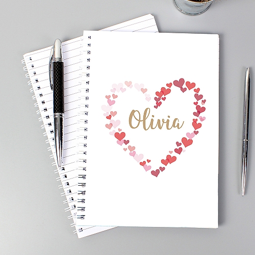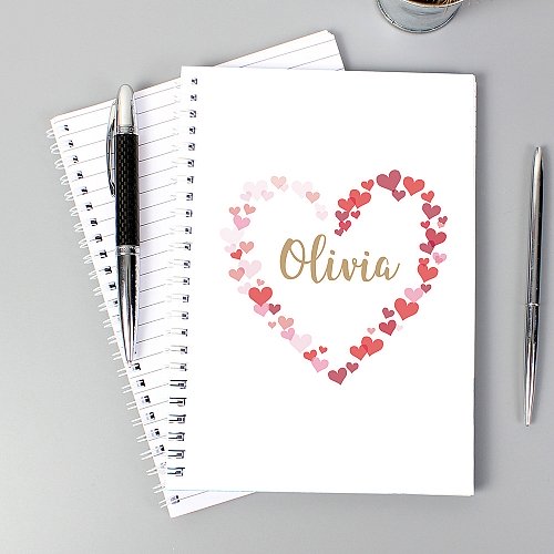 Personalised Confetti Hearts A5 Notebook Make lots of important notes in this Personalised Confetti Hearts A5 Notebook! The notebook can be personalised with a name up to 12 characters. The name is case sensitive and will appear as entered. Please avoid entering the name in block capitals as this may make it difficult to read. Ideal as a stocking filler or a Secret Santa gift The notebook contains approximately 64 double sided lined pages and page marker.