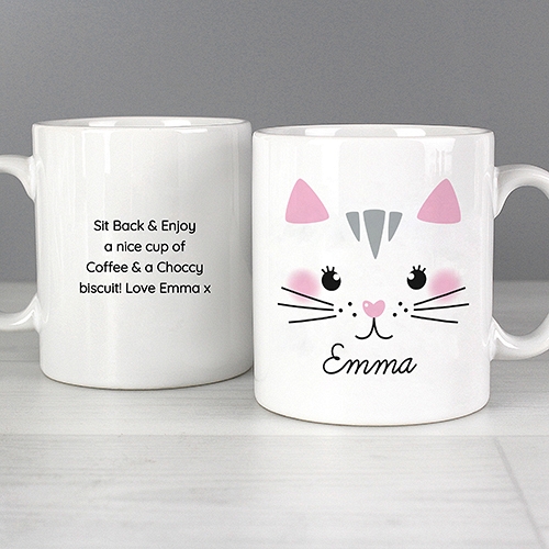 This super cute personalised cat face mug is perfect for any occasion! This mug can be personalised with any name on the front up to 12 characters long and a message over 4 lines with 25 characters available per line. Personalisation will appear as entered. Please avoid using block capitals on line 1 (name) as this may make the personalisation hard to read. Material is ceramic Perfect for any occasion!