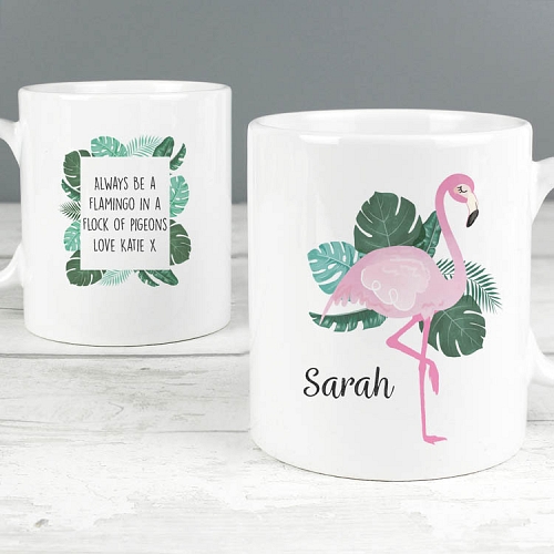 Our floral Personalised Flamingo mug is a stylish way to enjoy a hot beverage! This slim mug can be personalised with a name on the front up to 12 characters. The reverse of the mug can be personalised with 4 lines of text, with up to 20 characters per line. The name on the front is case sensitive and will appear as entered. Please avoid entering this in block capitals, as it may make the name difficult to read. The text on the reverse of the mug will appear in fixed upper case. Ideal as a stocking filler or a Secret Santa gift Hand washing is recommended. Material is ceramic. Ideal for Mother's Day and Birthdays.