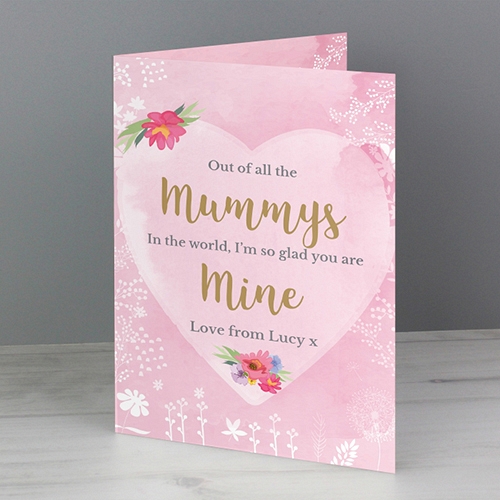 Personalised Floral Watercolour Card This Personalised Floral Watercolour Card is the perfect way to show appreciation to a special recipient. The card can be personalised with a name on the front up to 12 characters. A message at the bottom can also be added of up to 25 characters. The inside of the card can be personalised with 5 lines of text, with up to 25 characters per line. All personalisation is case sensitive and will appear as entered. Please avoid entering the text in block capitals, as this may make the personalisation difficult to read. The words 'out of all the', 'In the world, I'm so glad you are mine' are fixed text. All cards come in a brown outer envelope with a plain white envelope inside. All cards measure 185mm x 132mm.