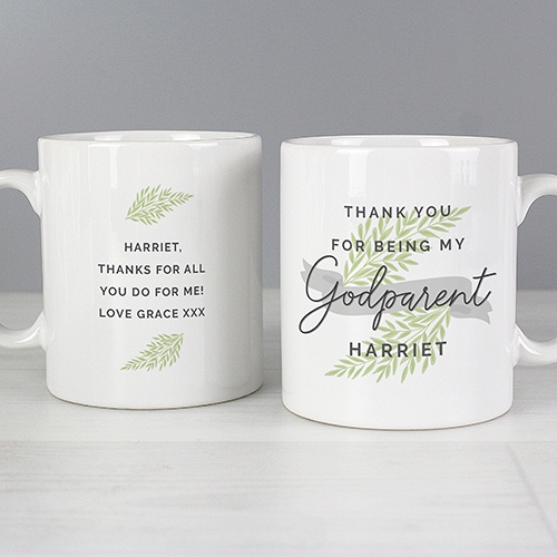 The perfect gift for any godparent! Personalise this Mug with: Front - Line 1 - up to 15 characters long Line 2 - up to 15 characters long Line 3 - up to 12 characters long Reverse - On the reverse of the mug - up to 4 lines with up to 20 characters per line "Godparent" is fixed text. The personalisation will appear in fixed upper case. Hand washing is recommended. Material is ceramic. Ideal for any occasion.