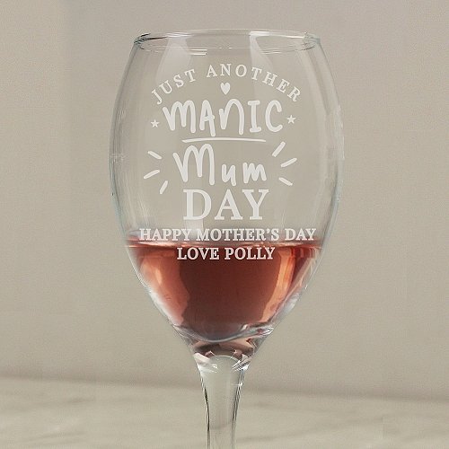 Personalised Manic Mum Day Wine Glass Our personalised wine glass is a must have for anyone who likes to relax and unwind with their favourite red, white or rose. The glass can be personalised with up to 2 lines of text with 20 characters per line Please note that the words 'Just another manic Mum day' are fixed and cannot be amended. This glass is supplied with a silver folding box, ready to give as a gift.
