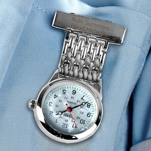 Our Personalised Nurse's Fob Watch is an ideal gift for a nurse, healthcare professional or beautician. Personalise this nurse's watch with 2 lines of text, with up to 20 characters per line. All text is case sensitive and will appear as entered. This fob watch has an easy to read dial with white luminous hands, making reading the time quick and easy. The watch casing is stainless steel plated. It also features a traditional brooch fastening. The watch is presented in a black pouch. The fob watch includes a 12 months manufacturer's warranty. Batteries are included. Battery type is SR626. Please note we cannot ship this item internationally. Ideal for Birthdays, Mother's Day, Graduation, New Job.