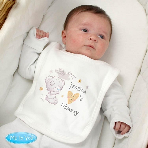 Personalise this Me To You Tiny Tatty Teddy I Heart Baby Bib with two names up to 12 characters in length. The personalisation is fixed upper case. The baby grow is 100% cotton, machine washable. Cool wash only. Iron on reverse only. Ideal for New-borns, Christenings, Baptism, Birthdays.