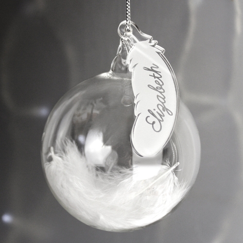 This Personalised White Feather Glass Bauble with Feather Tag will make a stunning addition to the Christmas tree. The Acrylic feather tag can be personalised with a name up to 11 characters. Please avoid entering the name in block capitals, as this may result in it being difficult to read. Each glass bauble is filled with a delicate white feather, which will look great hung on any Christmas tree! Please note these are handmade so there may be some slight imperfections such as small water marks due to the manufacturing process. Ideal for Christmas, Memorial.