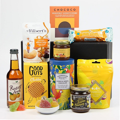 Send an impressive celebratory selection with this gourmet gift hamper! The Prestige Hamper features an impressive selection of treats and snacks, including a lemon and white choc chip biscuits, valencia orange and chocolate mix nuts, cheddar cheese biscuit melts, Devonshires pineapple and onoin chutney ideal for birthdays, holidays, or simply to show you care. This generous gift is perfect for any occasion! Hamper Contents: Mr Filberts Valencia Orange & Belgian Choc 40g James White Russet AppleJuice 250ml Good Guys Bakehouse Cheddar Biscuit Melts 50g Yummycomb 70% Dark Orange Bar 35g SugarSin Fizzy Tropical Gummies 100g Wild & Fruitful Seville Orange Marmalade 110g Farmhouse Biscuits Lemon and white choc chip biscuits 200g Chococo Milk Chocolate with Honey comb pieces 75g Otter Vale Devon Chutney Onion & Pineapple 225g Medium Black Box