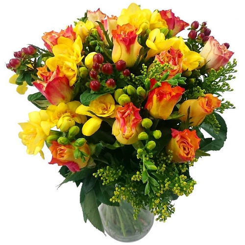 Luxurious Collection of Hand Tied Fresh Roses and Freesia From our fresh range of variety flowers we bring you the Rose & Freesia Bouquet. A luxury hand-tied bouquet of orange roses and fragrant freesia, attractively presented with solidaster, wrapped in stylish florist's gift-wrap, and delivered in our special box to prevent damage to your flowers in transit. Our freesia is delivered "in bud", which means the flowers have a longer vase life - so you have longer to enjoy the beauty and scent of your delivery of fragrant freesia! Roses and freesia really make for a great combination; roses are renowned for their distinctive, timeless allure whilst freesias are famous for their lovely aroma. The result is a bouquet that looks and smells fantastic, a true feast for the senses! The warm combination of orange and yellow hues ensures that the Rose & Freesia bouquet will create a compelling focal point wherever it is situated.