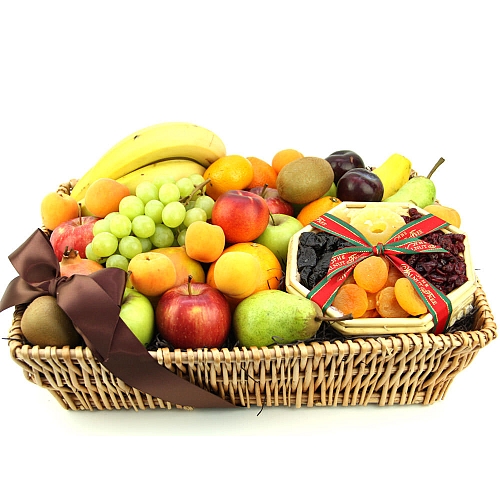 Wishful Delights Fruit Basket Fulfill the desire of natural fruity flavors of your loved ones with this Wishful Delights Fruit Basket. The basket is a complete package full of fresh and vivacious collection of fruits of assorted in a beautiful cane basket with silky ribbon. The fresh and juicy fruits are not enough but a small pack of dry fruits also ornament the fruit basket with its dazzling taste. Send this lavish fruits basket by post to UK for any grand occasion like Christmas, Wedding, Anniversary, Thanksgiving, or Congratulations with your personal message card attached. Hamper Contains: Assorted Dry Fruits 300gm Pears Plums Kiwi Nectarines Apricots Oranges Clementines Green Apples Red Apples Pomegranate Bananas Grapes Weight: 5.50kg Comes in Beautiful Basket elegantly gift wrapped with Ribbon and Free personalised message card.