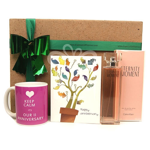 Wish your better half your beautiful 2nd year together in a touchy and memorable way, present her this 2nd anniversary mug which will always remind her to the lovely celebrations and an exquisite perfume which your beloved is sure to enjoy wearing and will remind her of you every time. Contains: Calvin Klein Eternity Moment Spray 100ml Customized “Keep calm it’s our second anniversary” mug Happy anniversary card Comes in a Gift Box Elegantly Gift wrapped with Ribbon and a Personalised Message card.