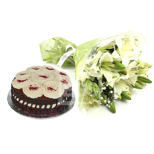 A gorgeous bouquet of nicely picked flowers and 2Lbs delicious cake of your choice from Kitchen Cuisine wrapped beautifully with free greeting card + free delivery. This arrangement is handmade using the Following Flowers below: 6 Stems of White Lilies 2 Stems of Gypsophila Green Foliage leaf Hand Tied by our Florist 2Lbs Cake from Kitchen Cuisine