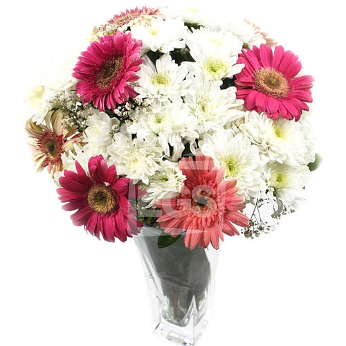 This stunningly chic blend of beautiful white and pink gerberas, chrysanthemums and gypsophilias sketches a nostalgic aura that knocks at the past and refreshes the sweet loving memories. Pink represents perfect happiness and white reflects harmony. Hence, this bouquet being a rare mix of happiness and harmony can peacefully delight your dear ones. This arrangement is handmade using the Following Flowers below: 8 Stems of Gerbera 7 Stems of Chrysanthemum 3 Stems of Gypsophila Green Foliage leaf Hand Tied by our Florist Vase not included. You can add one in the next step