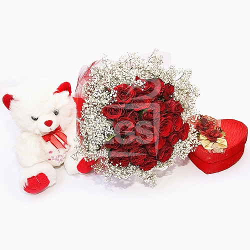 Red is the color of love. Send the memories of your most cherished moments with this bouquet of stunning red roses and an adorable teddy. This arrangement is handmade using the Following Flowers below: Teddy Bear 10 inch 16 Pieces Of Ferrero Rochers Chocolates In Heart Shape Box 24 Stems of Imported Red Roses 8 Stems of Baby Breath Green Foliage leaf Hand Tied Bouquet by our expert florist