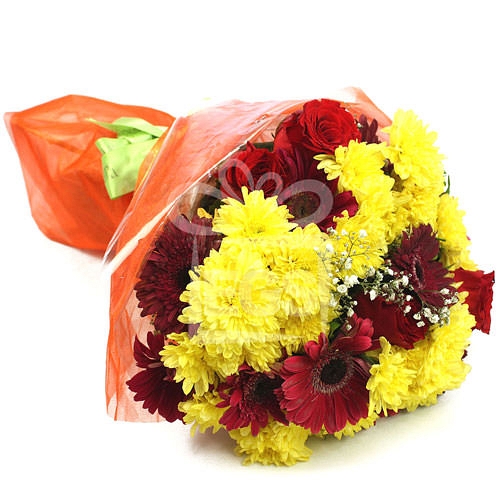 A plethora of flashy buds comes to its finest with an array of invigorating yellow chrysanthemums, gerberas and Gypsophila. Imagine the oh-so joyous moment of your affection being well received by your dear ones. This arrangement is handmade using the Following Flowers below: 5 stems of yellow Chrysanthemum 10 stems of Gerbera 2 stems of Gypsophila Green Foliage leaf Hand Tied by our Florist