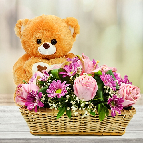 Exhibiting a sparkling chemistry of pink and purple blossoms, the sensual bouquet is filled with lilies, roses, Chrysanthemum and Gypsophila to charm your darling friends. Think no more and make a lasting impression with this captivating bouquet. Beautifully arranged in a Gift Basket this flower bouquet also features: 1 Teddy Bear 10 inch 6 Stems of Pink Roses 1 Stems of Pink Lily 2 Stems of Chrysanthemum 2 Stems of Gypsophila