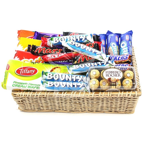 Chocolate Plus Impress your family, friends and business colleagues with one of our continental gift hamper.Brimming with a selection of fantastic hampers. Beautifully finished with a hand tied ribbon and your personalized message card, these make an IMPRESSIVE CORPORATE GIFT, or simply a HUGE INDULGENT TREAT! Contains: Tiffany Cream wafers pineapple flavor 153g Tiffany Cream wafers Orange flavor 153g Nutro Cream wafers Vanilla flavor 175g Nutro Cream wafers Strawberry flavor 175g OREO chocolate sandwich cookies 137g OREO Strawberry cream cookies 137g OREO Double delight cookies 137g Butter Cookies Tin Box 300g Bounty chocolate Bar (5-Bars) Kit Kat chocolate Bar (5-Bars) Snicker chocolate Bar (5-Bars) Mars chocolate Bar (5-Bars) Dairy milk chocolate Bar (5-Bars) Ferrero Rouchers 200g Comes in a cane Basket Elegantly Gift wrapped with Ribbon and a Personalised Message card.