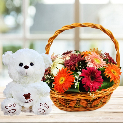 The vibrant assortment of orange, white and maroon flowers is as refreshing as witnessing a tranquil sunset. Accompanied by a seated little teddy, th basket makes a stunning gift straight from the heart. This arrangement is handmade using the Following Flowers below: