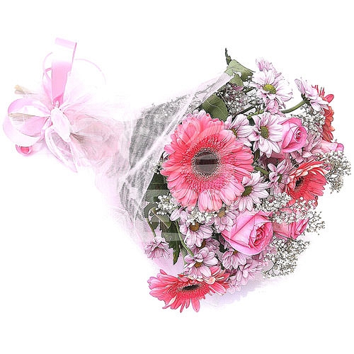 Exquisitely vibrant, this arrangement of luscious gerberas, chrysanthemums, roses and baby breaths nestled in lush greens will illuminate any room with natural beauty and the sweet floral fragrance will stimulate the mind. A beautiful gift for all ocassions. This arrangement is handmade using the Following Flowers below: 5 Stems of Gerberas 4 Stems of Pink Roses 5 Stems of Chrysanthemum 2 Stems of Baby Breath Green Foliage leaf Hand Tied Bouquet by our expert florist