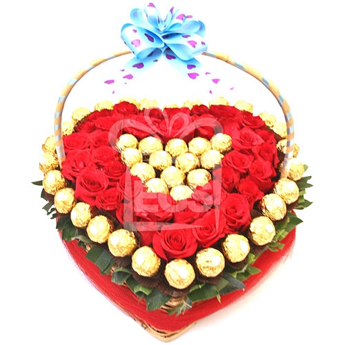 A big heart bouquet for showing the love and passion. It will convey your true heart feeling without saying a single word. It is a Heart shape red roses Basket arrangement combining in it the delicious and irresistible Ferrero Rocher chocolates. It would make the perfect valentines or anniversary flowers for someone who loves fragrance and beauty combined in one lovely bouquet. Key features: 36 to 48 Stems of Red Roses ( Depends on Flower Size ) 36 - 42 Ferrero Rocher chocolates Elegantly Arranged and tied up with a luxury Ribbon.