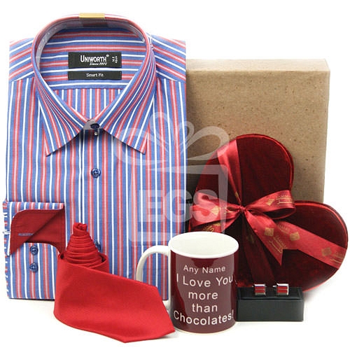 Express you love in a special way with this exclusive men’s gift hamper. Send it to your love one for a lasting impression. Hamper Contains: Uniworth Shirt 16pcs Ferrero Rocher Chocolates Heart Shape Box Customized “I love you more than chocolates” mug Cufflinks Tie Comes in a Brown Box Elegantly Gift wrapped with Ribbon and a Personalised Message card.